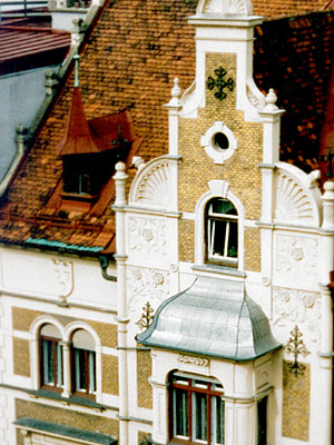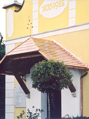 Eisenblech. Den First schmückt eine traditionelle Kupferschmiedearbeit - der Wetterhahn.