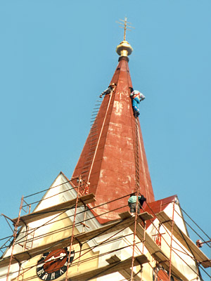 Ausgeführte Arbeiten: Dachreparatur des Kirchturmes. Die verwitterte Farbe des
