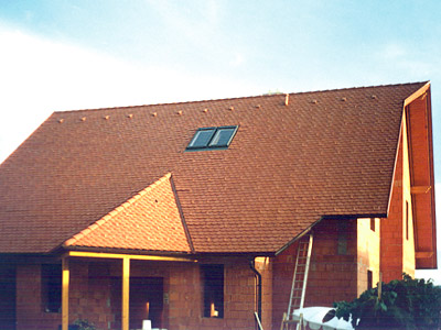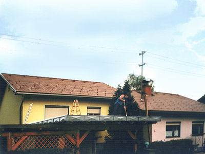 Ausgeführte Arbeiten: Die Deckung des Satteldaches erfolgte mit einem Kunststoff-Leichtdach,