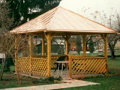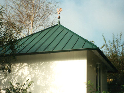 Ausgeführte Arbeiten: Garagendach, das Walmdach besteht aus verzinkten und beschichteten